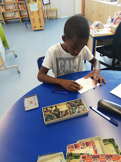 Nesta sessão, os alunos foram convidados a refletir sobre os acontecimentos da narrativa. Uma atividade bastante participativa, que nos fez a todos refletir sobre os nossos próprios comportamentos. Depois, seguindo a coerência da ilustração apresentada, os alunos experimentaram criar as suas próprias narrativas alternativas utilizando carimbos para a ilustração.